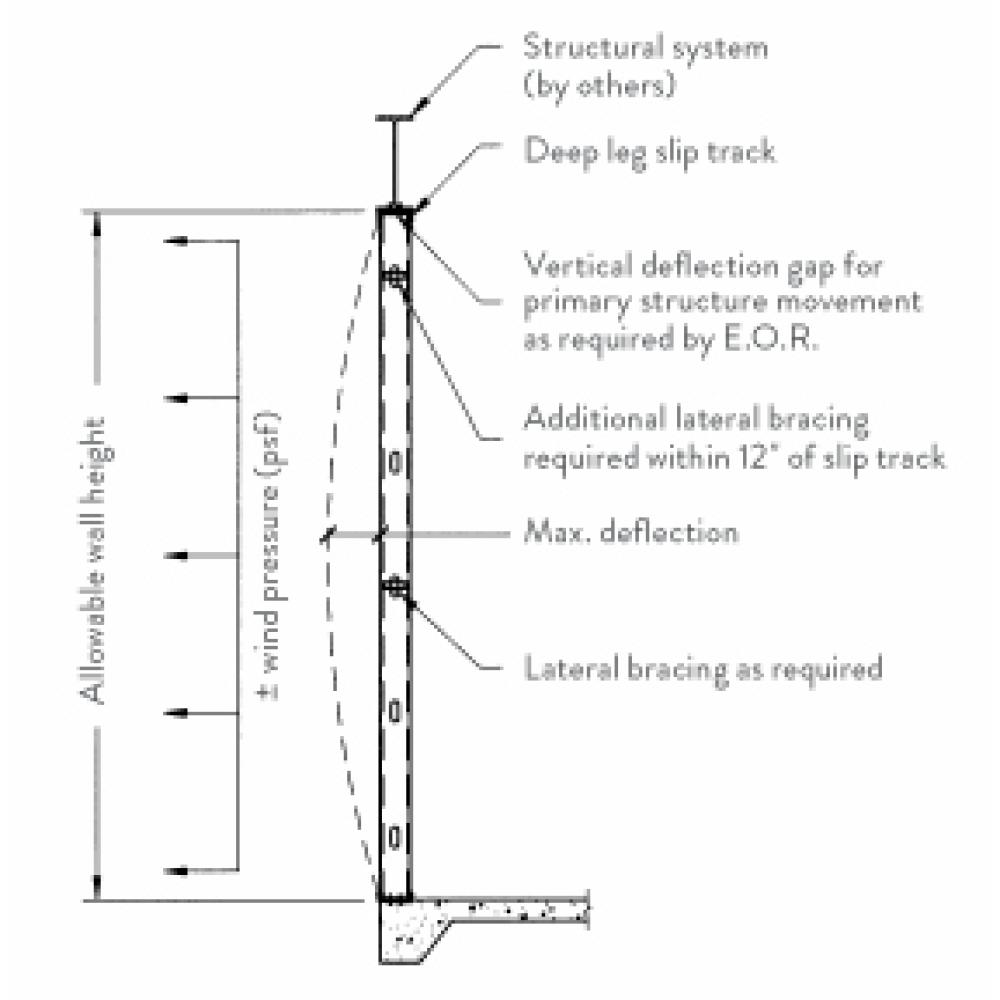 Exterior curtain walls are non-axial load bearing and must be designed to withstand the highest lateral loads, wind or seismic, prescribed by the building code for the particular construction location and type. Limited heights in the above lookup tool and tables are for single span systems only. It is recommended to have a vertical deflection gap between the top of the stud and top track for primary structure movement as required by the E.O.R. A deep leg deflection track system is used in this condition.