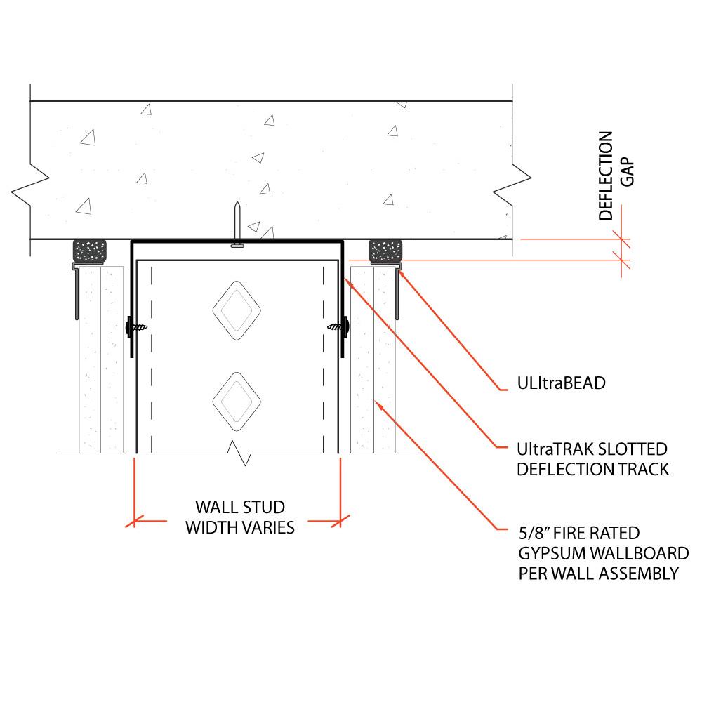 The UltraTRAK Slotted system utilizes a UltraTRAK slotted deflection track in conjunction with UltraBEAD providing a 1 or 2 HR rated assembly for a ¾” max joint and is UL 2079-Fifth Edition compliant.